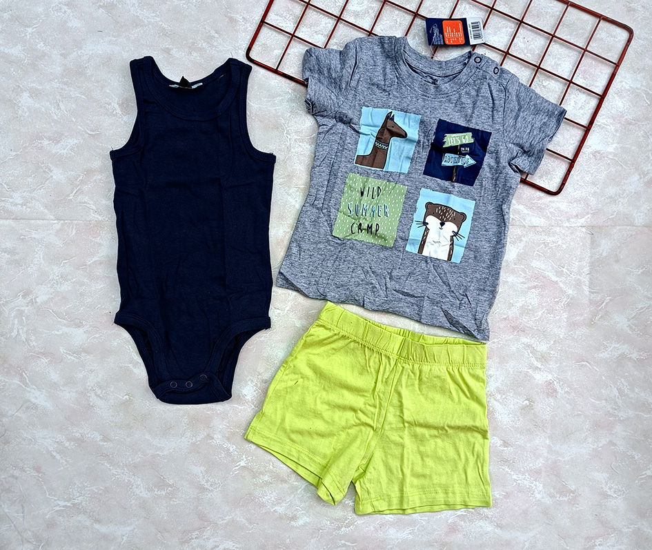 شامل سه تکه رکابی زیر دکمه شورت و تیشرت می باشد