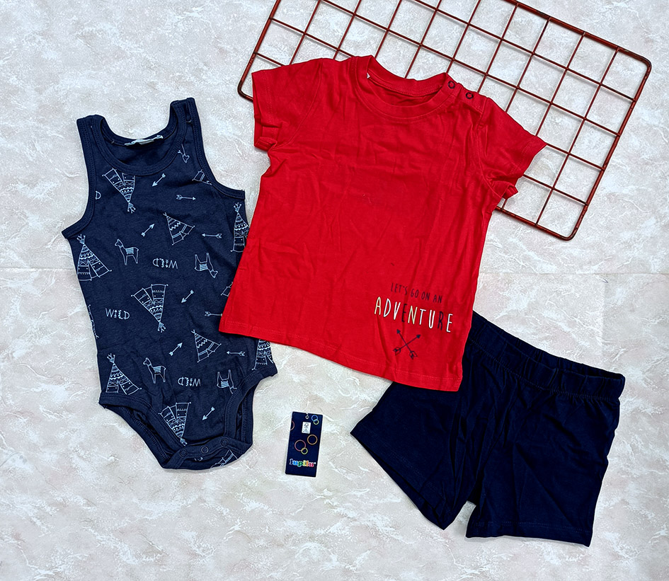 شامل سه تکه رکابی زیر دکمه شورت و تیشرت می باشد